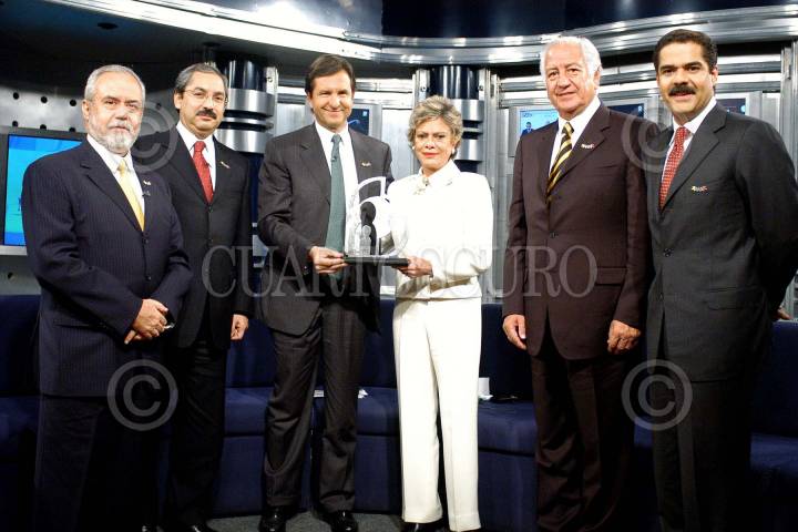 MEXICO, D.F. 26NOVIEMBRE2004.- Durante la realización del Décimo Noveno Día de Movimiento Azteca, en apoyo a la Fundación Michou y Mau, la meta de 5 millones de pesos fue superada, lográndose recaudar la cantidad de $10’ 508,000.00. En la imagen Natividad González, Gobernador de Nuevo León; Esteban Moctezuma, Virginia Sendel, Marcelo de Los Santos y Javier Alatorre. FOTO: CUARTOSCURO.COM