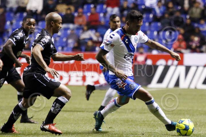 PUEBLA, PUEBLA, 08ENERO2017.- Los jugadores Nicolás Miguez Pablo y Mauricio Pabón disputan el balón durante jugada del partido entre los el Club Puebla y los Rayados de Monterrey correspondiente a la jornada 1 del torneo de clausura 2017 de la Liga MX con marcador final de 2-3 a favor de los visitantes, celebrado en el estadio Cuauhtémoc. FOTO: HILDA RÍOS /CUARTOSCURO.COM