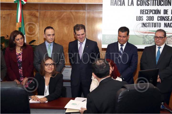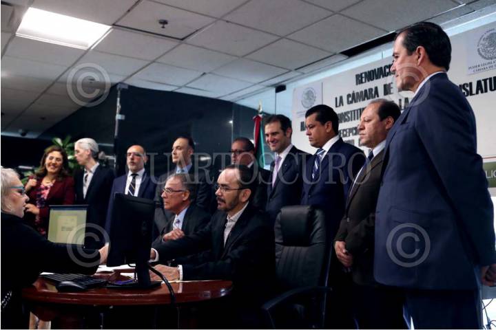 CIUDAD DE MÉXICO, 17JULIO2018.- El consejero presidente del INE, Lorenzo Córdova Vianello, y el presidente de la Cámara de Diputados, Mauricio Farah, durante la "Entrega de constancias a los legisladores electos para la próxima legislatura". FOTO: INE /CUARTOSCURO.COM
