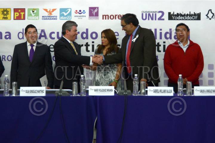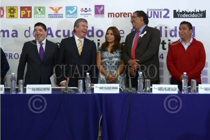 MÉXICO, D.F., 08MAYO2015.- Raúl Flores, líder del PRDDF y Mauricio López, líder del PRIDF, conversaron durante la firma de un pacto de civilidad entre los partidos con miras a la elecciones en el DF. Hace unos días seguidores de ambos partidos protagonizaron una riña que dejo varios heridos en la delegación Cuajimalpa. FOTO: VALERIA MÁRQUEZ /CUARTOSCURO.COM