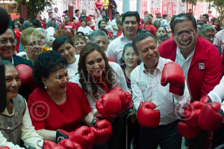MÉXICO, D.F., 03JUNIO2015.- Lourdes Ruiz, mejor conocida como la reina del albur, Carmen Salinas, actriz y candidata priista a una diputación federal, Cynthia López Castro, candidata tricolor a la ALDF, César Camacho Quiroz, dirigente nacional del PRI y Mauricio López, dirigente local del tricolor, durante un evento proselitista en la unidad habitacional La Fortaleza, ubicada en el barrio de Tepito. FOTO: MOISÉS PABLO /CUARTOSCURO.COM