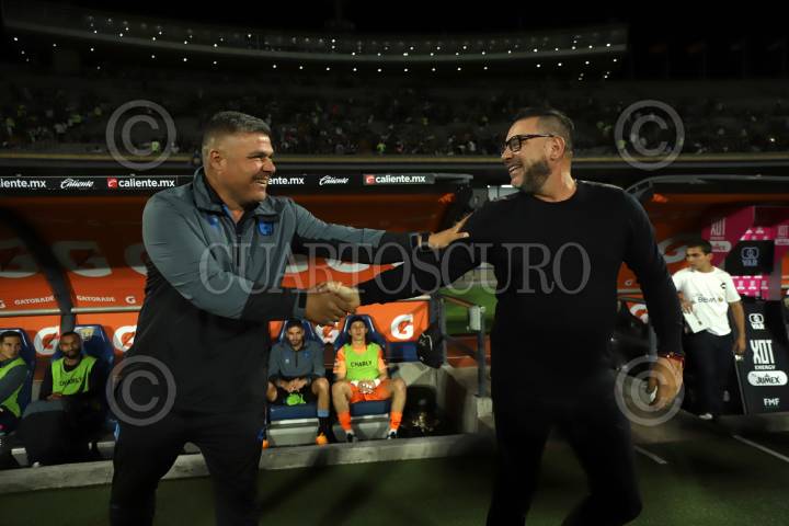 CIUDAD DE MÉXICO, 04AGOSTO2023. Los Directores Técnicos Mauro Gerk y Antonio Mohamed se saludan previo al partido de fútbol Pumas vs Querétaro correspondiente a la jornada 11 del Torneo Apertura 2023 de Liga BBVA MX, en el Estadio Olímpico Universitario. FOTO: EDGAR NEGRETE/CUARTOSCURO.COM