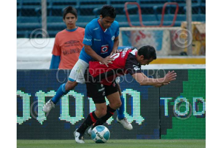 MÉXICO, D.F., 27FEBRERO2010.- Maximiliano Biancucchi de la maquina celeste del Cruz Azul choca con un jugador de los zorros del Atlas; partido que ganó la maquina celeste 3 goles por 1 en el estadio Azul de la jornada 8 del torneo Bicentenario del futbol mexicano. FOTO: RODOLFO ANGULO/CUARTOSCURO.COM