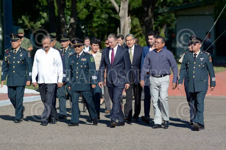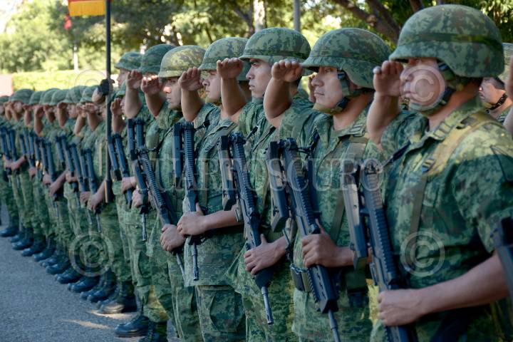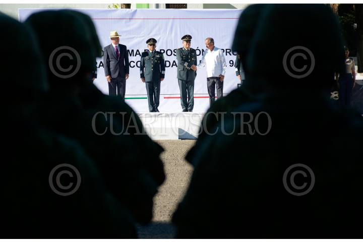 CULIACÁN, SINALOA, 04DICIEMBRE2018.- El General de División DEM, Carlos Román Carrillo del Villar, comandante de la Tercera Región Militar, dio posesión al General de Brigada DEM Maximiliano Cruz Ramos como comandante de la Novena Zona Militar, en sustitución de Ernesto Alejandro Vadillo Trueba. El General Carrillo del Villar encabezó el protocolo militar de cambio de mando en ceremonia de toma de protesta con la presencia del gobernador de Sinaloa, Quirino Ordaz Coppel, el delegado Estatal de Programas de Desarrollo Integral, José Jaime Montes, además del alcalde de Culiacán Jesús Estrada Ferreiro y el coordinador de la Comisión de Seguridad Pública en el H. Congreso del Estado, diputado Mario González Sánchez. Ambos generales operaran en el llamado "Triángulo Dorado", zona permeada por el narcotráfico y que abarca los estados de Durango, Sinaloa y los límites con Chihuahua. Durante este acto, militares rindieron los honores de ordenanza al General Maximiliano Cruz Ramos, que fue designado por el Presidente de la República, Andrés Manuel López Obrador, para esta nueva responsabilidad. Al término del evento, el gobernador Quirino Ordaz resaltó la excelente relación y coordinación que se ha mantenido con las autoridades castrenses, mismas que se espera continúen con los nuevos mandos, a fin de obtener los mejores resultados para Sinaloa en materia de seguridad pública. FOTO: JUAN CARLOS CRUZ /CUARTOSCURO.COM