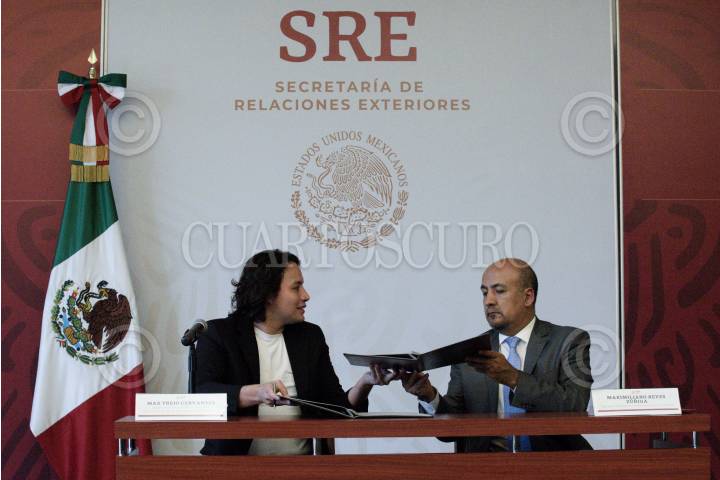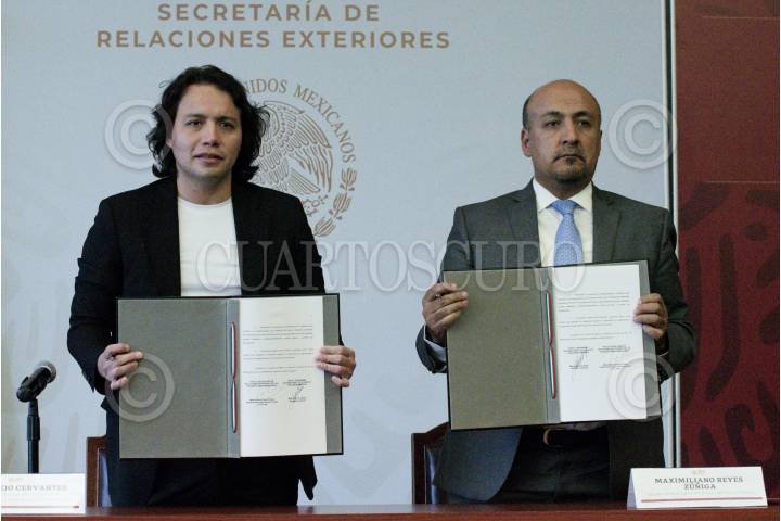CIUDAD DE MÉXICO, 18JUNIO2019.- Max Trejo, titular del Organismo Internacional la Juventud (OIJ), y Maximiliano Reyes Zúñiga, subsecretario de Relaciones Exteriores, encabezaron la firma del convenio entre la OIJ y SRE, con motivo del impulso y creación de proyectos entre estas dos instituciones. FOTO: MARIO JASSO /CUARTOSCURO.COM