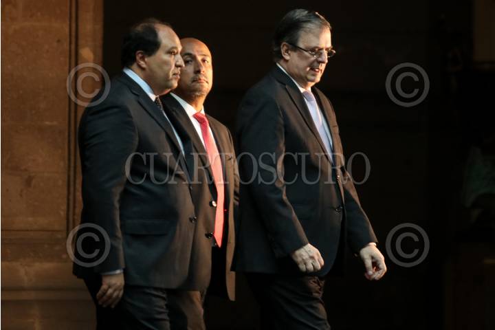 CIUDAD DE MÉXICO, 17OCTUBRE2019.- Lázaro Cárdenas, jefe de asesores del Gobierno de México, Maximiliano Reyes, subsecretario para América Latina y el Caribe de la Secretaría de Relaciones Exteriores, y Marcelo Ebrard, secretario de Relaciones Exteriores, durante la ceremonia de bienvenida al presidente de Cuba, Miguel Díaz-Canel. FOTO: GALO CAÑAS /CUARTOSCURO.COM