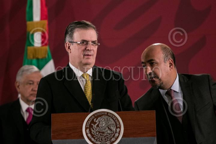 Andrés Manuel López Obrador, presidente de México, Marcelo Ebrard, secretario de Relaciones Exteriores, y Maximiliano Reyes, subsecretario para América latina y el Caribe, durante la conferencia.