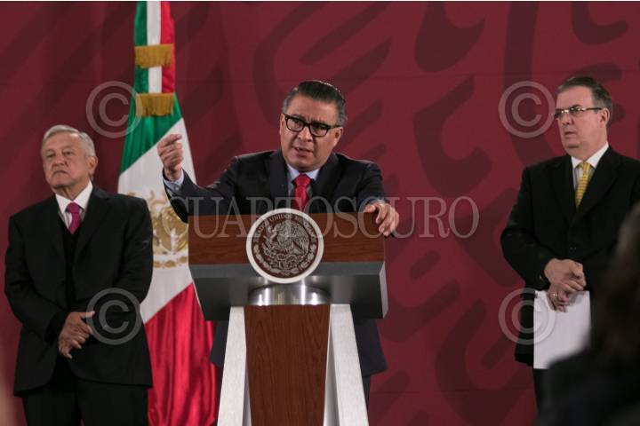 Andrés Manuel López Obrador, presidente de México, Horacio Duarte Olivares, subsecretario de Empleo de la Secretaría del Trabajo y Previsión Social (STPS), y Marcelo Ebrard, secretario de Relaciones Exteriores, durante la conferencia.