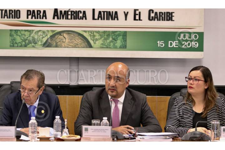 CIUDAD DE MÉXICO, 15JULIO2019.- El diputado Raúl Bonifaz Moedano; Porfirio Muñoz Ledo, presidente de la mesa directiva en la Cámara de Diputados; Maximiliano Reyes Zuñiga, subsecretario para América Latina y el Caribe y la diputada Julieta Vences Valencia, durante la reunión de asuntos migratorios, asuntos Frontera Norte y asuntos Frontera Sur, la cual fue relaizada en la Cámara de Diputados. FOTO: CUARTOSCURO.COM