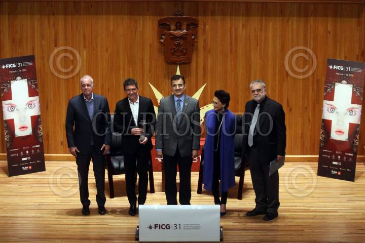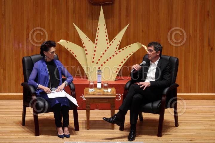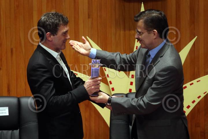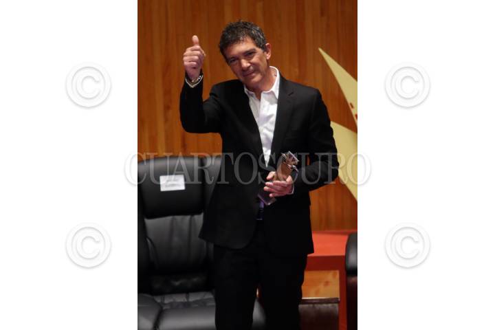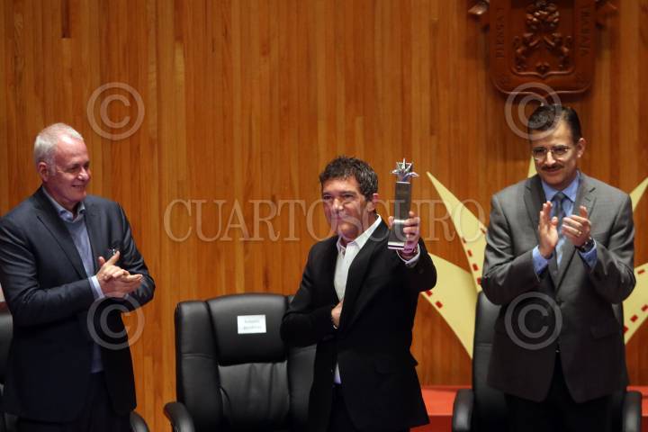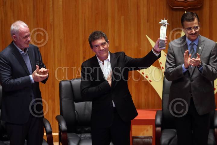 GUADALAJARA, JALISCO. 08MARZO2016.- El actor español Antonio Banderas, recibió de manos de las máximas autoridades del Festival y Universidad de Guadalajara, el premio Mayahuel de Plata al cine Iberoamericano por su gran trayectoria, esto en el marco de la edición 31 del Festival Internacional de Cine en en Guadalajara (FICG) y en evento que se llevo a cabo en el Paraninfo Enrique Díaz de León. FOTO : FERNANDO CARRANZA GARCIA / CUARTOSCURO.COM
