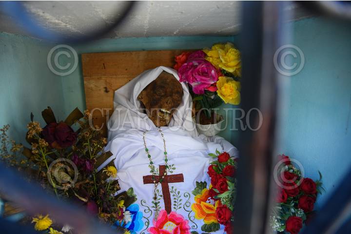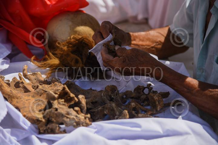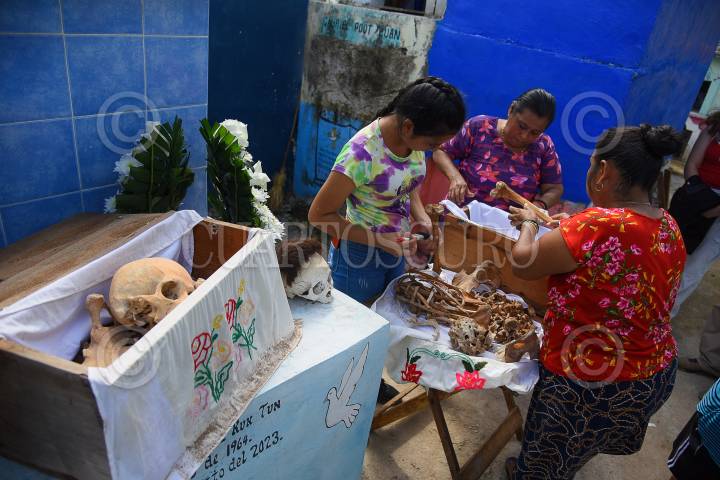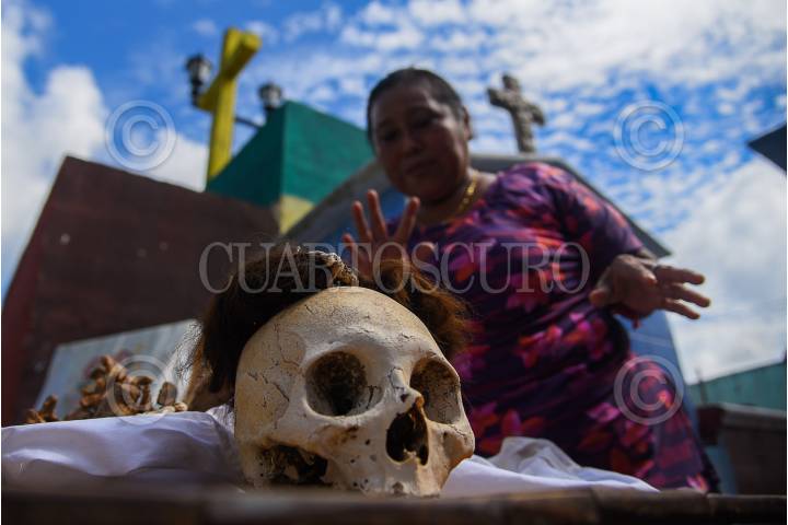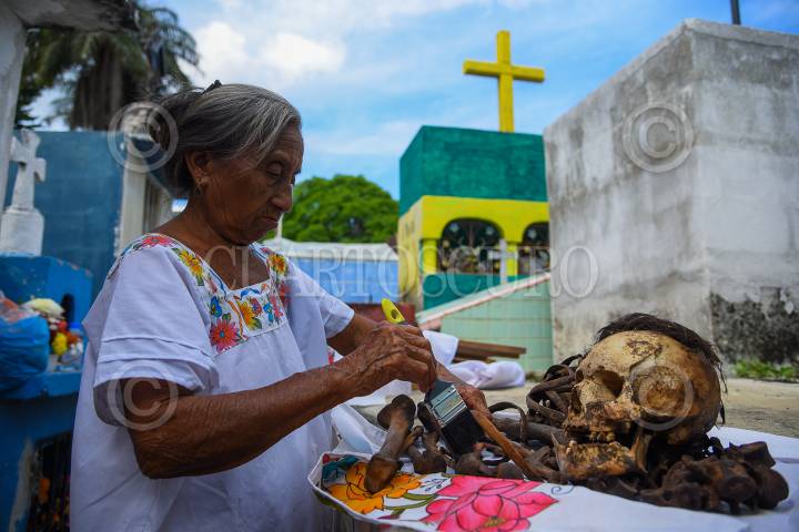 POMUCH, CAMPECHE, 27 DE OCTUBRE 2024.- El silencio se interrumpe en los estrechos pasillos del cementerio de poblado de Pomuch, en la víspera del regreso de las animas. Hoy, los murmullos de las pláticas entre vivos resuenan, mientras comienza el ritual ancestral maya del Choo Ba’ak o limpieza de huesos. Una tradición que se realiza previo al Hanal Pixàn o comida de las animas en el Día de muertos, cuando las familias se reúnen para honrar a sus seres queridos. En este ritual de conexión entre vivos y muertos se limpian y decoran los osarios; cuidadosamente se retiran los huesos limpiándolos uno a uno con brochas o trapos y se reemplaza el manto que los cubre por otro bordado y adornado con flores. Maria Esther Poot Tuz, acompañada de sus familiares y transmitiendo la tradición a los más jóvenes de la familia, realiza la limpieza de trece familiares, tradición que heredo de sus abuelos, ella explica que la limpieza de huesos, simboliza un baño para los difuntos, mientras que el cambio de manto representa la ropa nueva que usaran las almas del regreso del mas allá. Los hermanos Ermilo Pool y Manuel Pool, también mantienen la tradición, cada año ambos acuden al cementerio para realizar la limpieza de sus familiares. Manuel, quien perdió a su hija a temprana edad sigue preservando este acto como un homenaje a sus familiares y que prometió acudir hasta que sea llamado para reunirse con ellos. FOTO: MICHAEL BALAM/ CUARTOSCURO.COM