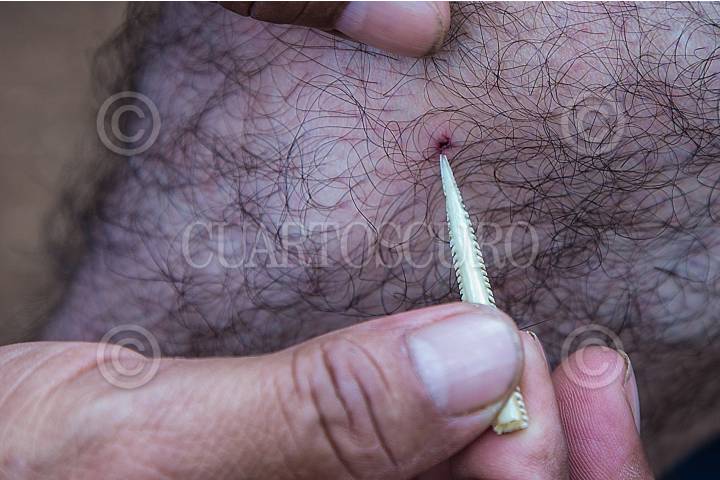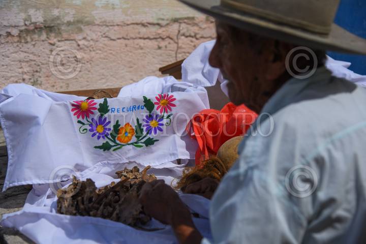 Don Felipe, sacerdote maya de la comunidad de Chunyaxnix, hace el llamado a los aluxes empleando un silbato con figura de mono.