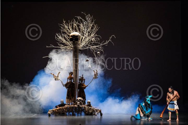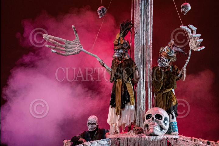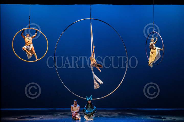 CIUDAD DE MÉXICO, 27 DE JULIO DE 2025.- La compañía Tránsito Cinco Artes Escénicas presentó la obra Salto mortal al Xib’alb’a en el Teatro de las Artes del Centro Nacional de las Artes (Cenart), con localidades agotadas. El montaje, dirigido por Jorge Díaz Mendoza y con producción ejecutiva de Jessica González, incorpora acrobacias aéreas, danza y escenografía, y toma como base narrativa los mitos contenidos en el Popol Vuh, con énfasis en la historia de los gemelos Ixb’alanke y Hunahpú, quienes se enfrentan a los señores del Xib’alb’a, el inframundo en la cosmogonía maya. FOTO: SECRETARÍA DE CULTURA / CUARTOSCURO.COM