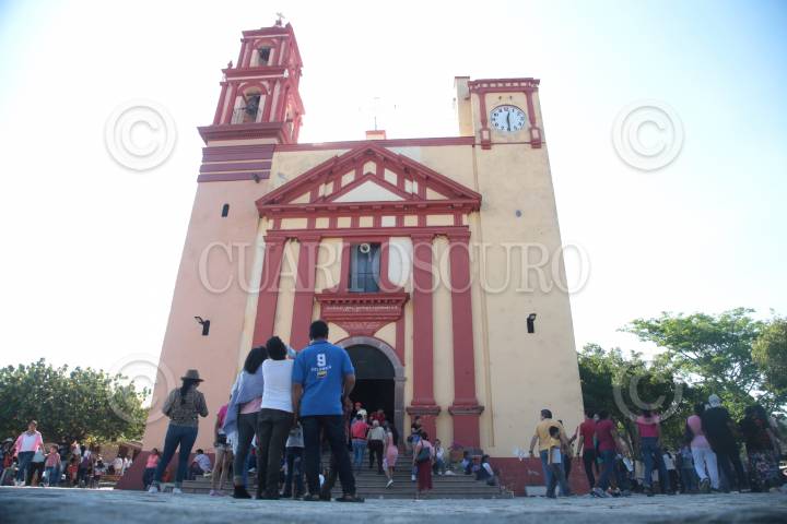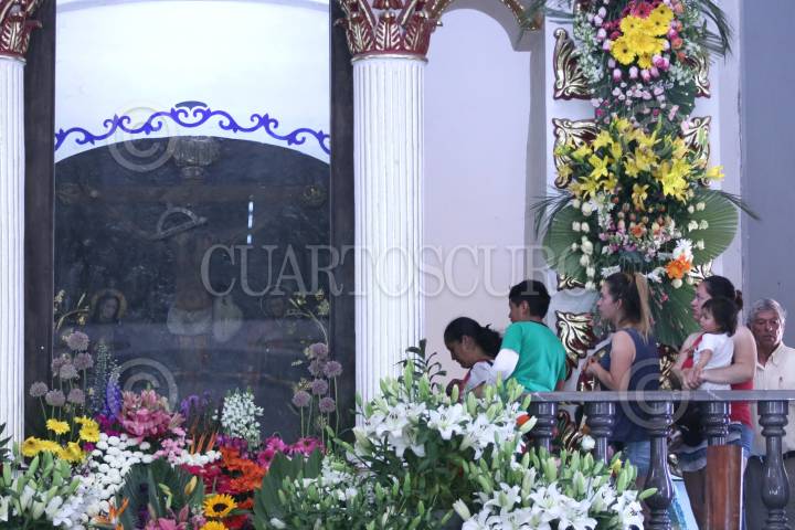 Católicos pasan a mirar la figura del Cristo del Calvario durante la Feria de la Loma en Mazatepec Morelos.