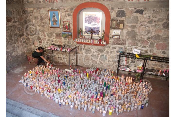 Una mujer coloca una veladora durante la Feria de la Loma en Mazatepec, Morelos.