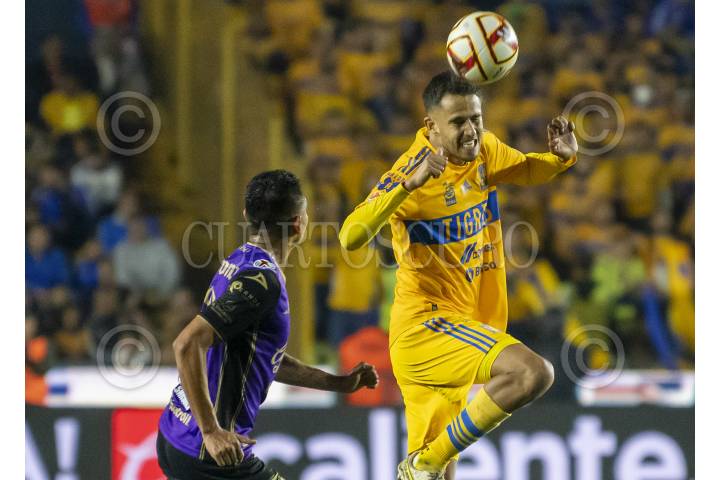 Fernando Gorriarán de Tigres se disputa el balón con Oswaldo Alanís, de Mazatlán FC, en el estadio universitario, partido correspondiente a la jornada 14 de la Clausura 2023.