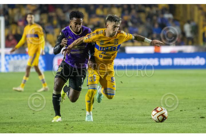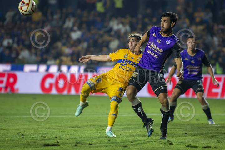 Diego Reyes de Tigres se disputa el balón con Miguel Seansores de Mazatlán FC, en el estadio universitario, partido correspondiente a la jornada 14 de la Clausura 2023.