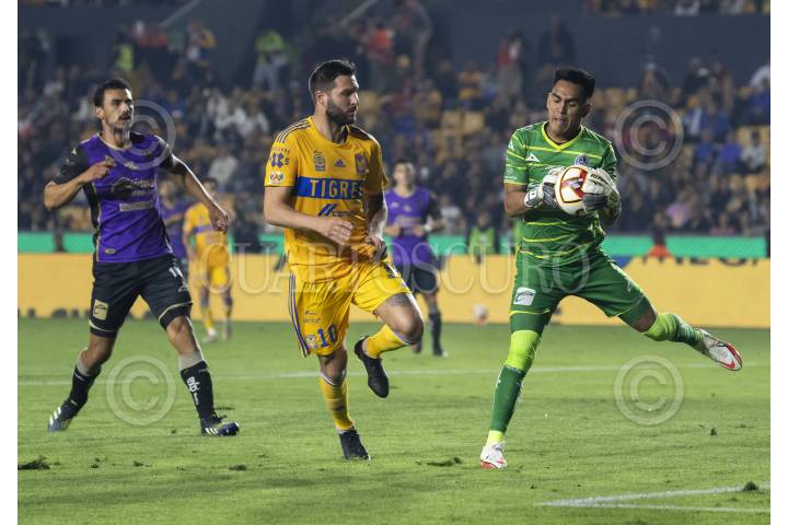 André Pierre Gignac de Tigres se disputa el balón con Ricardo Gutiérrez, portero de Mazatlán FC, en el estadio universitario, partido correspondiente a la jornada 14 de la Clausura 2023.