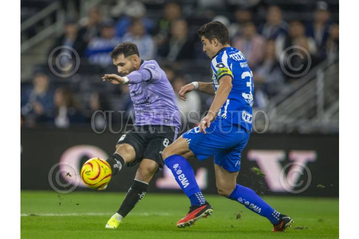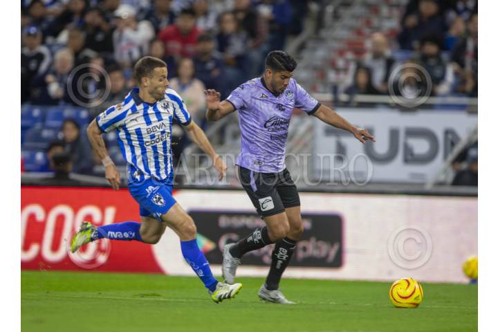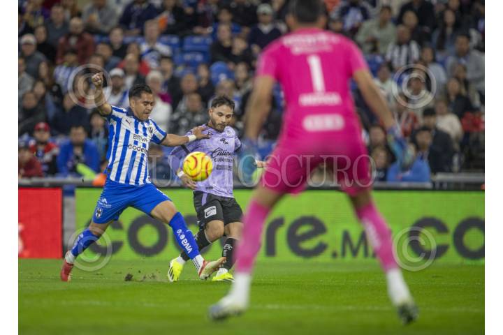 GUADALUPE, NUEVO LEÓN, 10MARZO2024.- Luis Romo de los Rayados del Monterrey se disputa el balón con Ventura Alvarado del Mazatlán FC, en el estadio BBVA, partido correspondiente a la jornada 11 de la Clausura 2024. Marcador Final: Monterrey: 2 - Mazatlán FC: 1 FOTO: GABRIELA PÉREZ MONTIEL / CUARTOSCURO.COM