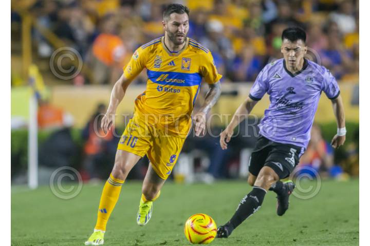 SAN NICOLÁS DE LOS GARZA, NUEVO LEÓN, 16MARZO2024.- André_Pierre Gignac de Tigres, se disputa el balón con Facundo Almada de Mazatlán FC, en el estadio Universitario, partido correspondiente a la jornada 12 de la Clausura 2024. Marcador Final: Tigres: 5 - Mazatlán FC: 1. FOTO: GABRIELA PÉREZ MONTIEL / CUARTOSCURO.COM