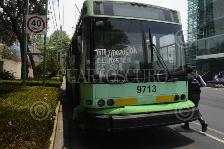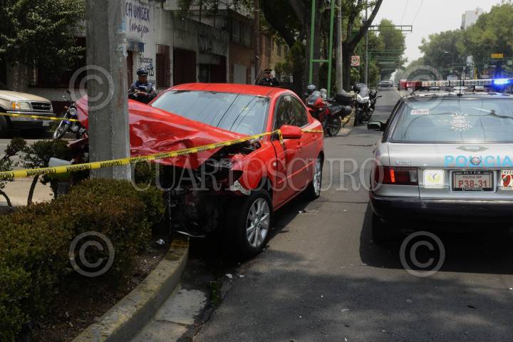 MÉXICO D.F., 09MAYO2013.- El auto Mazda placas 585-RDZ se impacto contra un Trolebus en Eje Central a la altura de la calle Republicas de la colonia Portales, minutos después de que éste fuera despojado de sus dueños calles antes. Los delincuentes huyeron dejando sus armas al interior del auto robado. FOTO:LUIS CARBAYO /CUARTOSCURO.COM