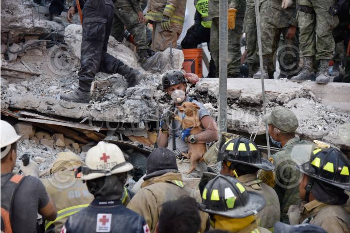 CIUDAD DE MÉXICO, 20SEPTIEMBRE2017.- Ciudadanos y cuerpos de rescate, continuaron con las labores en el edificio ubicado entre la avenida Torreón, Medellín y Viaducto. En la imagen un perro fue rescatado de los escombros del edificio. FOTO: MARIO JASSO /CUARTOSCURO.COM