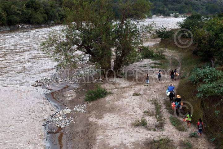 Una familia camina por la orilla del río Balsas en el poblado de Papalutla en el estado de Guerrero.