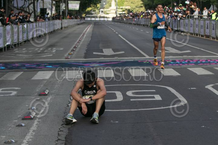 CIUDAD DE MÉXICO, 14JULIO2024.- Un corredor recupera el aliento tras cruzar la meta del Medio Maratón de la Ciudad de México BBVA, que tuvo como punto de salida el Monumento del Caballito al Ángel de la Independencia. FOTO: MOISÉS PABLO/CUARTOSCURO.COM
