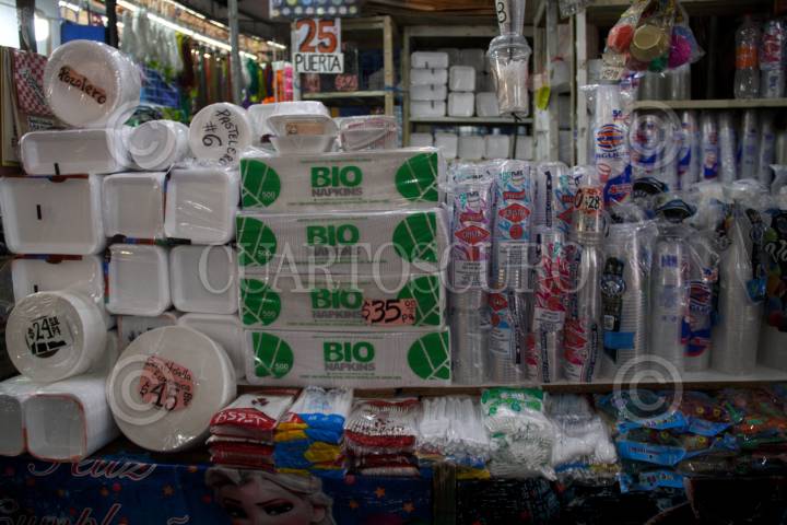 Aspecto de plásticos que apartir del primero de enero de 2021, la Ley de Residuos Sólidos de la Ciudad de México entrará en vigor, prohibiendo el uso de estos como vasos, platos, cubiertos, globos, popotes a excepción de los que son compostables.