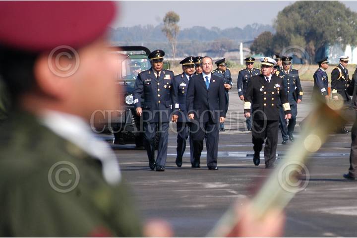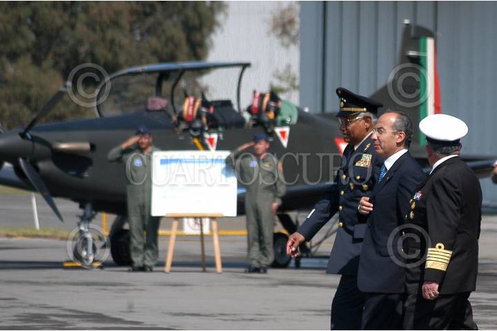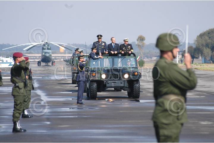MÉXICO D.F. 10FEBRERO2007.- El presidente Felipe Calderón Hinojosa, acompañado del secretario de defensa Guillermo Galvan Galvan y del secretario de marina, Mariano Francisco Saynez Medoza, acudio al desayuno conmemorativo al "Día de La Fuerza Aérea Mexicana" que se realizo en la base de Santa Lucía. FOTO: GUILLERMO PEREA/CUARTOSCURO.COM