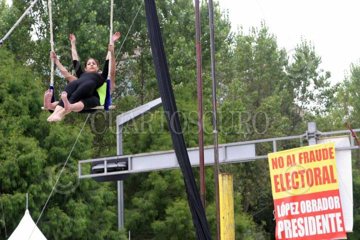 MEXICO, D.F., 02AGOSTO2006.- Simpatizantes de Andrés Manuel López Obrador, que permanencen en plantón desde el domingo sobre Reforma, practican aerobics en sus campamentos. FOTO: Saúl López/CUARTOSCURO.COM