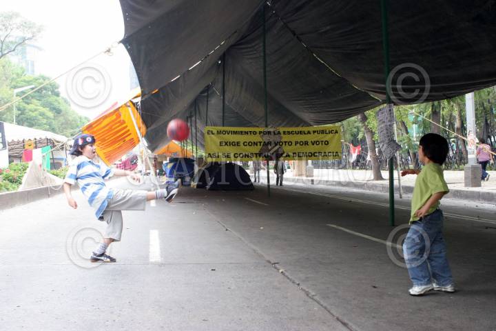 MEXICO, D.F., 02AGOSTO2006.- Los simpatizantes de Andrés Manuel López Obrador, quienes permanecen en plantón desde el domingo, aprovechan que no hay paso de vehículos sobre Reforma para jugar una cascarita. FOTO: Saúl López/CUARTOSCURO.COM
