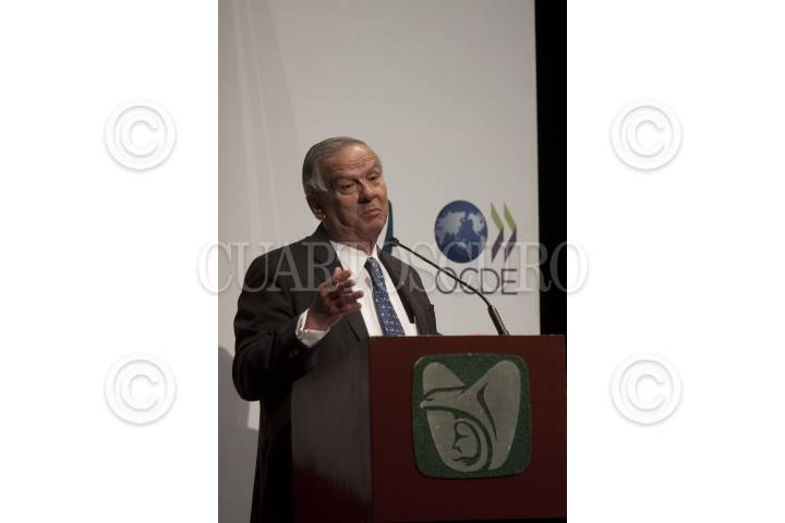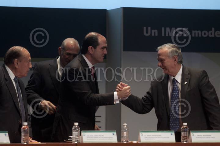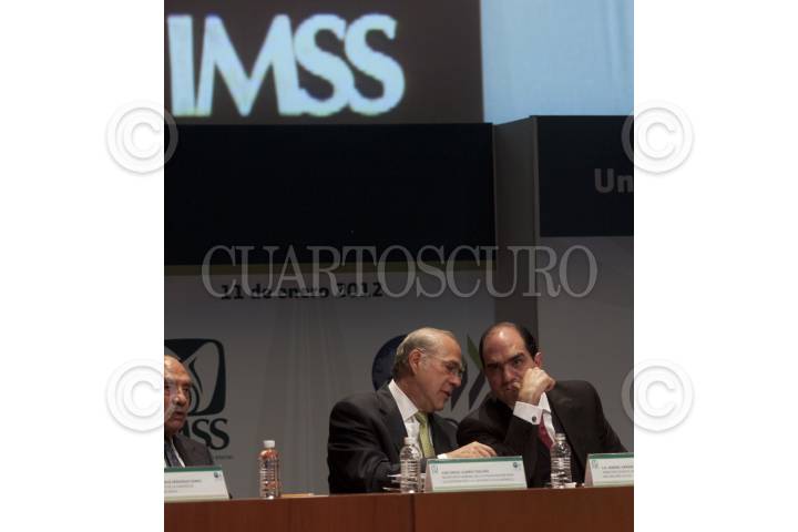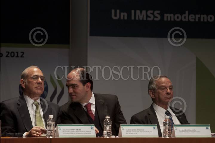 MÉXICO, D.F., 11ENERO2012.- José Ángel Gurría, secretario general de la Organización para la Cooperación y el Desarrollo Económicos (OCDE), Daniel Karam Tomeuh, director del IMSS, y Rafael Morgan Ríos, secretario de la Función Pública, durante la presentación del estudio sobre la contratación pública "Aumentar la eficiencia e integridad para una mejor asistencia médica", en el auditorio Moisés Callejas de la sede del instituto. José Ángel Gurría, reconoció que aunque el Instituto Mexicano del Seguro Social (IMSS) registró avances en la transparencia del ejercicio de sus recursos públicos, aún persisten actos de colusión y corrupción de servidores públicos. FOTO: MOISÉS PABLO/CUARTOSCURO.COM