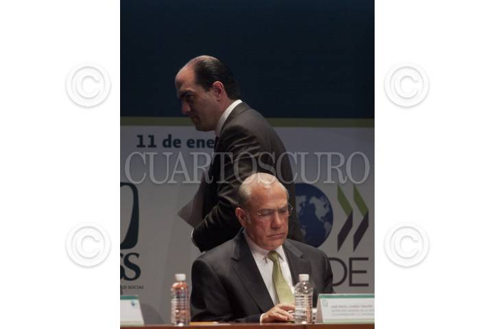 MÉXICO, D.F., 11ENERO2012.- José Ángel Gurría, secretario general de la Organización para la Cooperación y el Desarrollo Económicos (OCDE), y Daniel Karam Tomeuh, director del IMSS, durante la presentación del estudio sobre la contratación pública "Aumentar la eficiencia e integridad para una mejor asistencia médica", en el auditorio Moisés Callejas de la sede del instituto. Gurría reconoció que aunque el Instituto Mexicano del Seguro Social (IMSS) registró avances en la transparencia del ejercicio de sus recursos públicos, aún persisten actos de colusión y corrupción de servidores públicos. FOTO: MOISÉS PABLO/CUARTOSCURO.COM