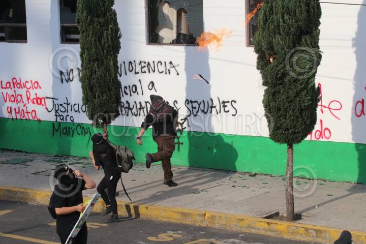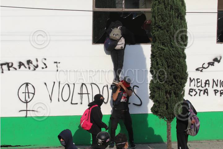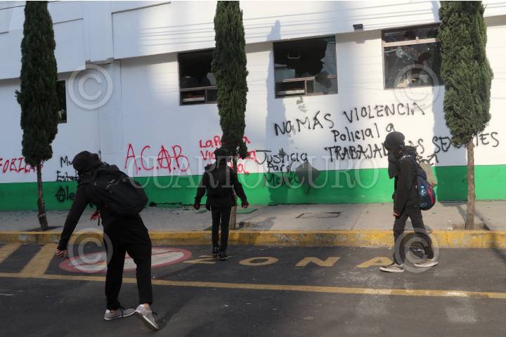 Encapuchados ocasionaron destrozos en las instalaciones de la Fiscalía General de la Justicia (FGR) para exigir justicia por Melanie, mujer de 15 años, quién fue agredida por los policías en la manifestación del viernes pasado