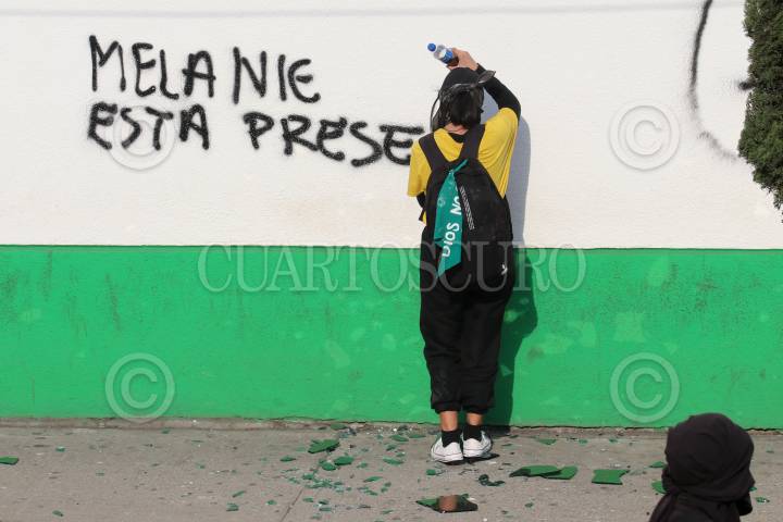 Una joven rayó una pinta en las instalaciones de la Fiscalía General de la Justicia (FGR) para exigir justicia por Melanie, mujer de 15 años, quién fue agredida por los policías en la manifestación del viernes pasado