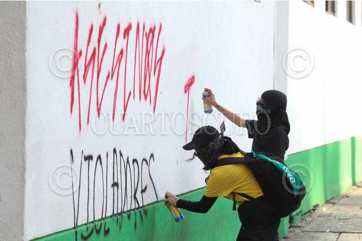 Encapuchados rayaron unas pintas en las instalaciones de la Fiscalía General de la Justicia (FGR) para exigir justicia por Melanie, mujer de 15 años, quién fue agredida por los policías en la manifestación del viernes pasado