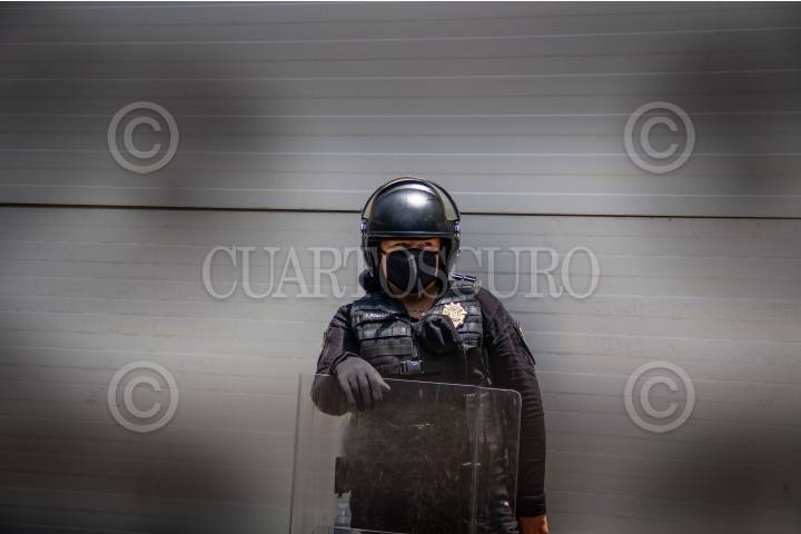 Una mujer policía se logra ver entre los barrotes que resguardan la casa en representación a Jalisco, previo a la manifestación