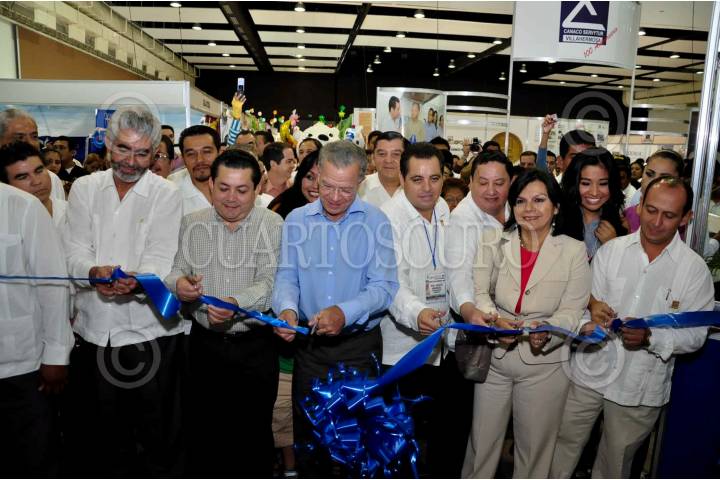 VILLAHERMOSA, TABASCO, 28NOVIEMBRE2010.- Andres Granier Melo, gobernador del estado corto el liston inaugural de la exposicion comercial al celebrarse el 100 Aniversario de la Camara Nacional de Comercio, siendo acompanado de Jesus Manuel Raul Soberano, lider estatal de la CANACO, Ignacio Lastra Marin Secretario de Desarrollo y Turismo local, entre otras personalidades. El evento se realiza en el centro de convenciones Tabasco Dos mil, donde participan 165 comerciantes, productores y prestadores de servicios. FOTO: MARCO POLO GUZMAN HERNANDEZ/CUARTOSCURO.COM