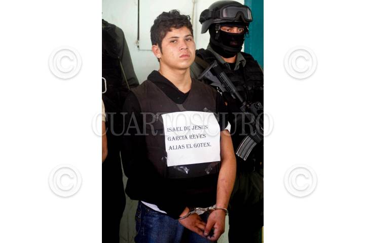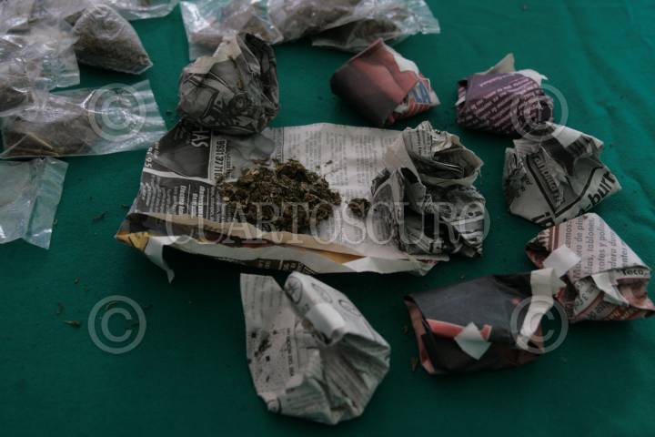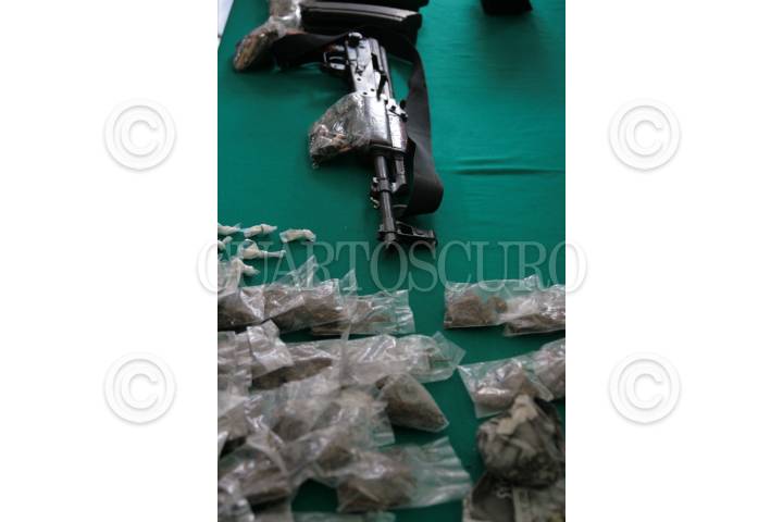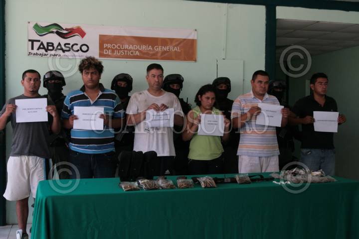 VILLAHERMOSA, TABASCO, 12OCTUBRE2010.- El procurador local anuncio en rueda de prensa que fue detenida la banda de sicarios que dio muerte a los familiares del fallecido marino Melquisedet Angulo Cordova. Los integrantes de la celula delictiva "Zeta" fueron presentados con un lote de drogas, una arma larga y cartuchos utiles en las instalaciones de la Policia Ministerial. FOTO: MARCO POLO GUZMAN HERNANDEZ/CUARTOSCURO.COM