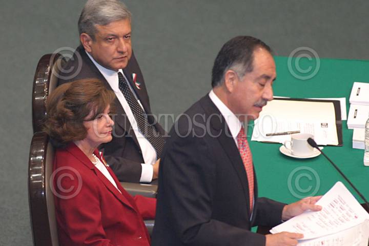MEXICO, D.F., 07ABRIL2005.- Andrés Manuel López Obrador, jefe de gobierno, se presentó ante el pleno de la Cámara de Diputados que se erigió en Jurado de Procedencia, para decidir si se le retira el desafuero, en el caso de desacato a una orden judicial en el caso del predio del Encino. En la imagen, el mandatario local observa a Carlos Vega Memije, representante de la PGR que es la parte acusadora. FOTO: Moisés Pablo/CUARTOSCURO.COM