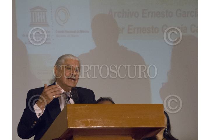 MÉXICO, D.F., 31AGOSTO2012.- Ernesto García, hijo de Ernesto García "Chango" Cabral, ofreció un discurso después de recibir el Registro Memoria del Mundo de México que reconoce la Organización de las Naciones Unidas para la Educación, la Ciencia y la Cultura (UNESCO), por la obra pictórica y gráfica de su padre el "Chango Cabral". FOTO: MOISÉS PABLO /CUARTOSCURO.COM