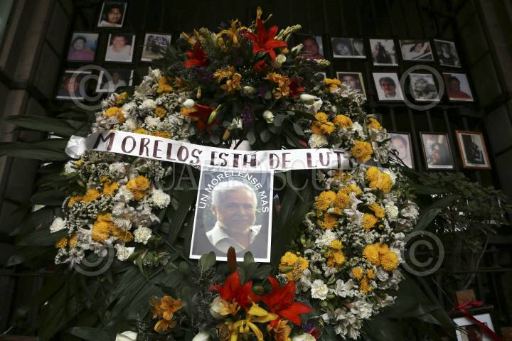 CUERNAVACA, MORELOS, 07JUNIO2024.- Integrantes de la Asociación de Comunicadores, Reporteros, Locutores y Productores de Morelos (AICREPMOR) realizo una protesta, llevando una corona de flores y mantas donde se leía la leyenda "7 de Junio Día de la Libertad de Expresión, Nada que celebrar" al Memorial de las Victimas, en el portal del Palacio de Gobierno. La organización denuncio las condiciones laborales en que trabajan los comunicadores en el estado de Morelos, entre las que se cuentan, bajos salarios, ningún beneficio social como es acceso a la salud entre otros, además de recordar a Manuel González y Roberto Carlos Figueroa, periodistas asesinados en este sexenio en la entidad. FOTO: MARGARITO PÉREZ RETANA/CUARTOSCURO.COM