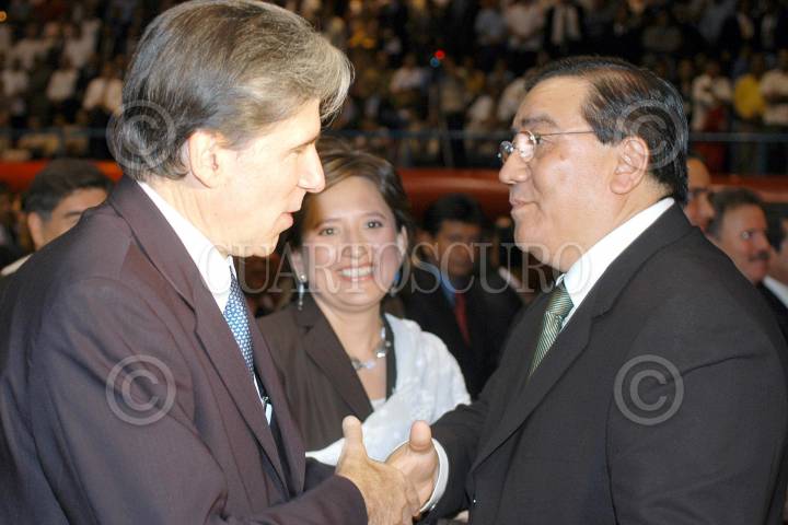 TUXTLA GUTIERREZ, CHIAPAS, 08DICIEMBRE2004.- Julio Frenk, Secretario de Salud saluda a Pablo Salazar Mendiguchia, gobernador de Chiapas en su cuarto informe de gobierno. Frenk asistió en representación del Presidente de la República, Vicente Fox. FOTO: Oscar León/CUARTOSCURO.COM