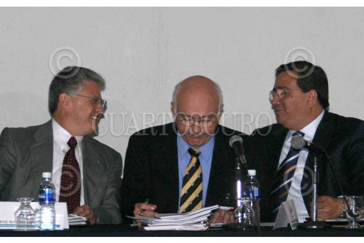 Juriquilla, Queretaro 06 Febrero 2003.- Alfonso Sanchéz Anaya, gobernador de Tlaxcala conversa con Pablo Salazar Mendiguchia, gobernador de Chiapas Mietras David Colmenares, representante de la secretaria de hacienda atestigua el momento. FOTO: Nelly Salas/CUARTOSCURO.COM