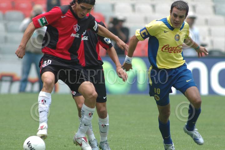 MEXICO, D. F. 08MAYO2005.- Ulises Mendivil (Atlas) disputa un balón con Cuauhtemoc Blanco (América) donde las Águilas del América se impusieron 5 goles a 2 a los rojinegros del Atlas en el partido de la jornada 17 del torneo de clausura 2005. FOTO: Iván Stephens/CUARTOSCURO.COM
