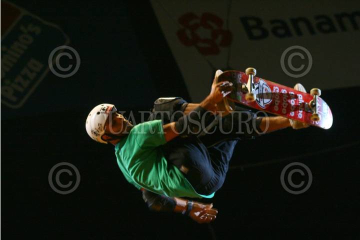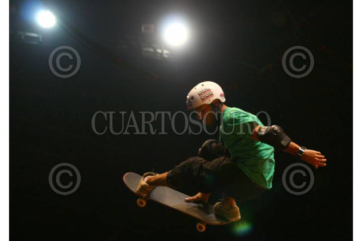 MÉXICO,D,F.,09SEPTIEMBRE2007.-El brazileño Rodrigo Menezez segundo lugar de la competencia realiza uno sus saltos durante la final del skate vert de los X Games en el Palacio de los Deportes. FOTO:SASHENKA GUTIERREZ/CUARTOSCURO.COM
