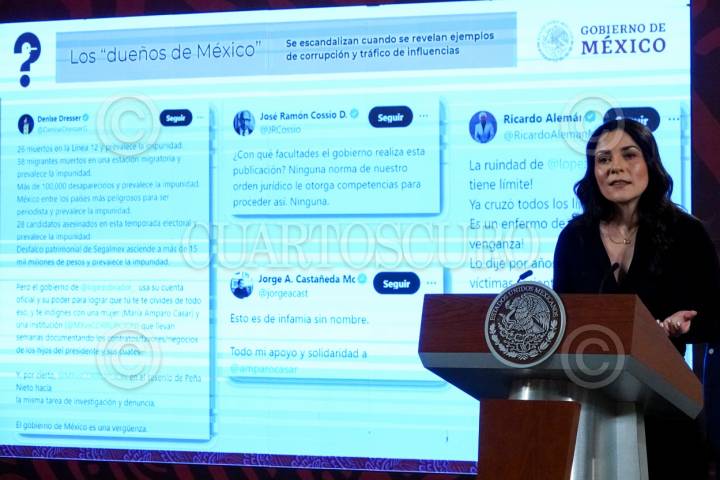 CIUDAD DE MÉXICO, 08MAYO2024.- Ana Elizabeth García Vilchis, titular de la sección “¿Quién es quién en las mentiras de la semana?”, muestra las respuestas de comunicadores y diversas figuras públicas tras la publicación sobre la pensión de la directora de Mexicanos Contra la Corrupción, María Amparo Casar. FOTO: GALO CAÑAS/CUARTOSCURO.COM