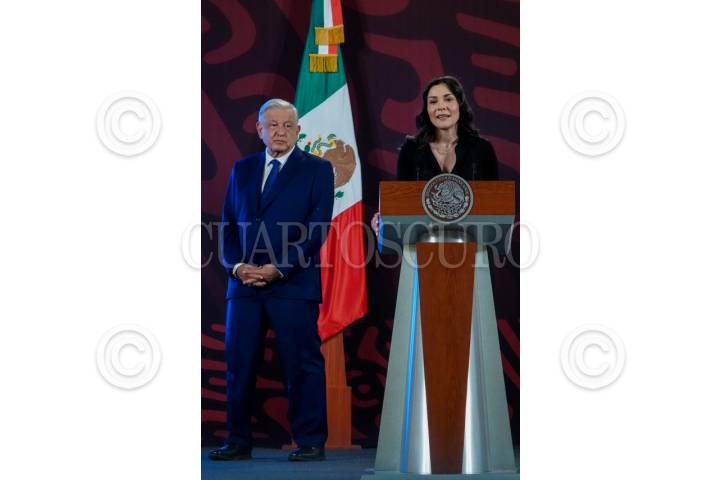 CIUDAD DE MÉXICO, 08MAYO2024.- Andrés Manuel López Obrador, presidente de México, y Ana Elizabeth García Vilchis, titular de la sección “¿Quién es quién en las mentiras de la semana?”, durante la conferencia matutina desde Palacio Nacional. FOTO: GALO CAÑAS/CUARTOSCURO.COM
