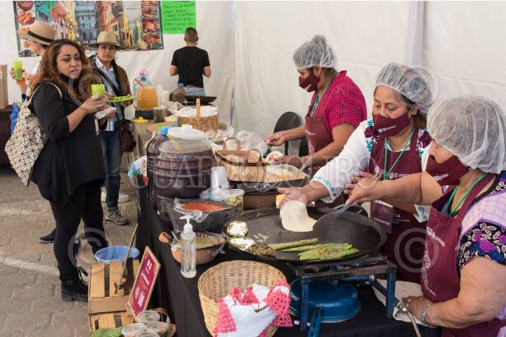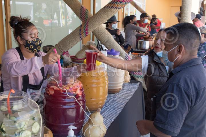 Personas acudieron a comprar alimentos gastronómicos en el Mercado El Solar de Cencalli ubicado en el Complejo Cultural Los Pinos.